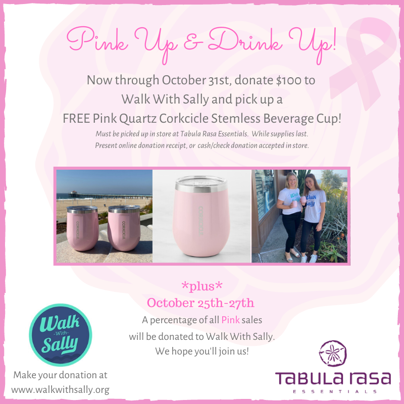Starting now through Sunday, donate $100 to local charity Walk With Sally and you'll take home a FREE Pink Quartz Corkcicle Beverage cup while supplies last. Value $24.00. We are celebrating mentors who provide leadership and guidance to children who are living with or have lost a parent or sibling to cancer. Buy anything PINK at Tabula Rasa Essentials Thursday through Sunday and we'll donate 20% of your purchase to Walk With Sally. Please join us!