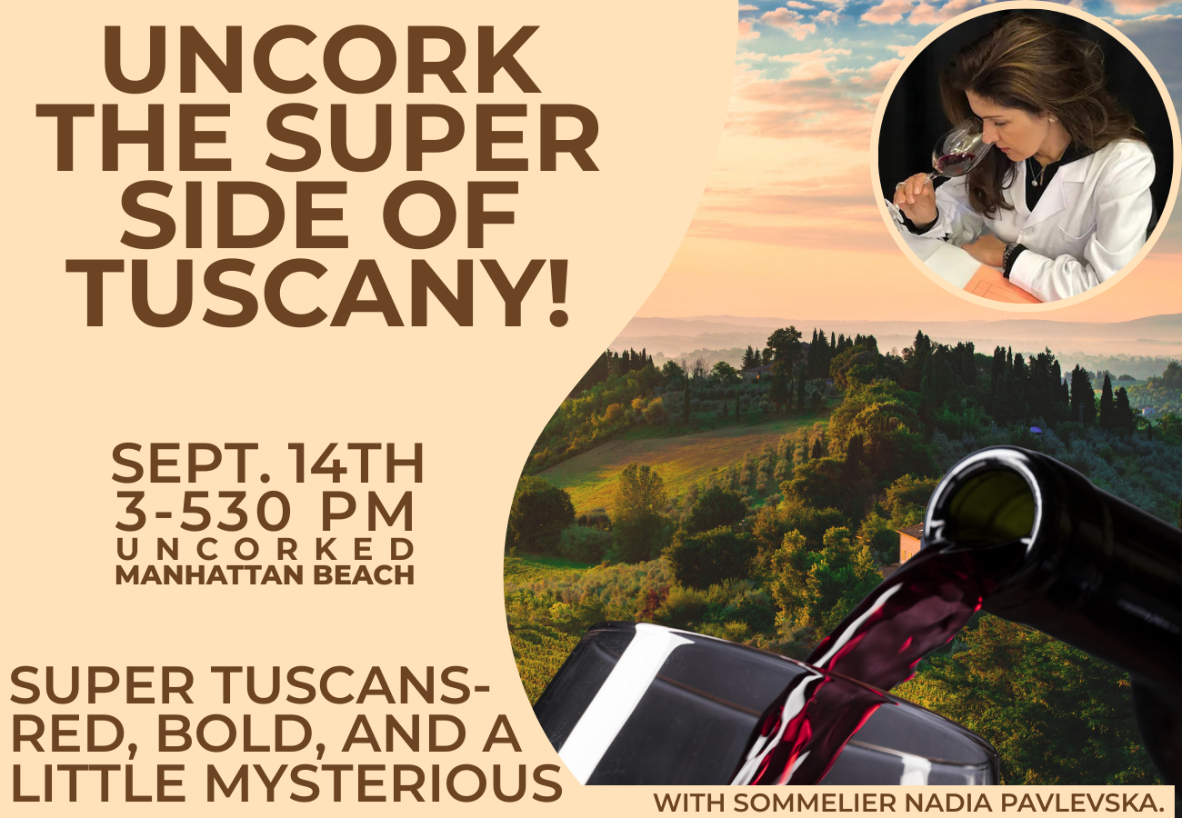 Join us at Uncorked in Manhattan Beach for a captivating Sunday afternoon where wine, history, and a hint of rebellion come together. Guided by Nadia Pavlevska — Professional Sommelier, Certified Italian Wine Specialist, and engaging wine storyteller — this 2.5-hour seated tasting will uncover how a bold rule-breaker became one of Italy’s most celebrated wine styles.